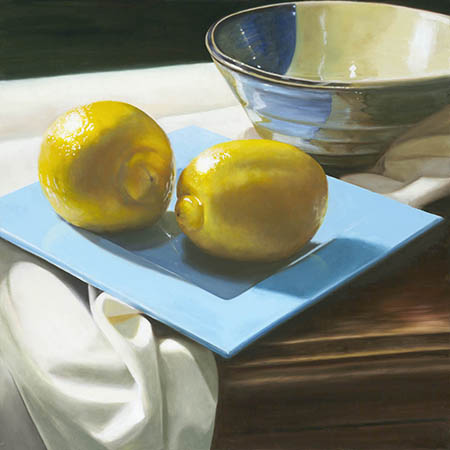 “Two Lemons”, oil on canvas, 24 X 24″ Giclée print available. $175