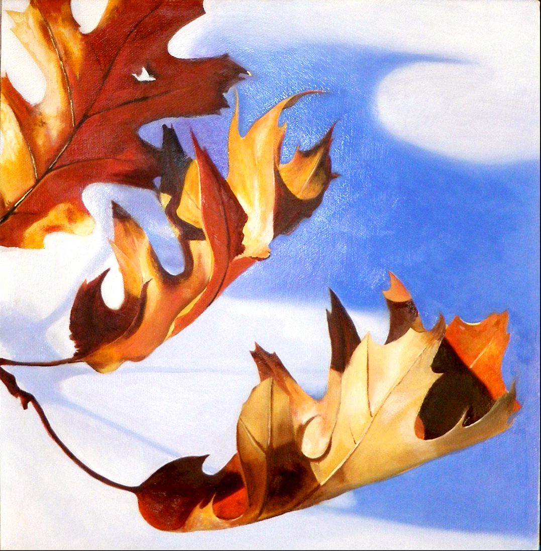 “Oak Leaves on the Snow” Oil on canvas, 12 X 12″ Giclée print available. $125