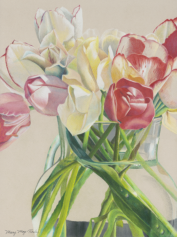 “Tulips” colored pencil on paper. 9 X 12″ Giclée print available. $150